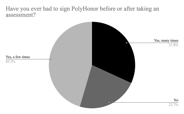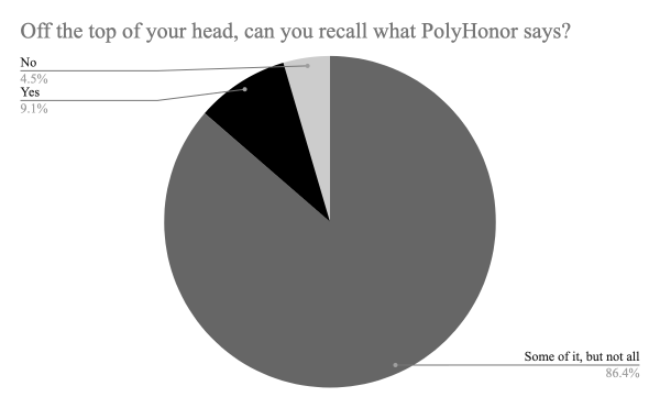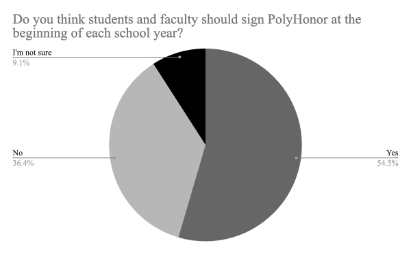 Interestingly, a slight majority of students disagree with this decision. I surveyed 10 students from each grade. Of the 22 respondents, 12 (54.5%) responded “Yes” to the question “Do you think students and faculty should sign PolyHonor at the beginning of each school year?” while 8 (36.4%) responded “No” and 2 (9.1%) responded “I’m not sure.”