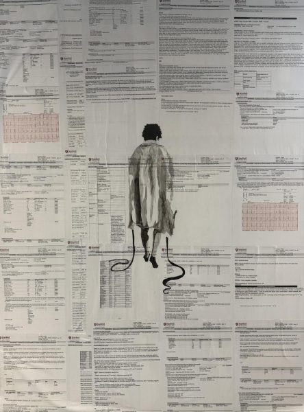 Another meaningful achievement was creating his “First Steps” piece. Scholze shared, “The mixed-media piece depicts my first moments of recovery after open-heart surgery. It shows a small figure walking across hospital records representing the overwhelming journey of healing.”